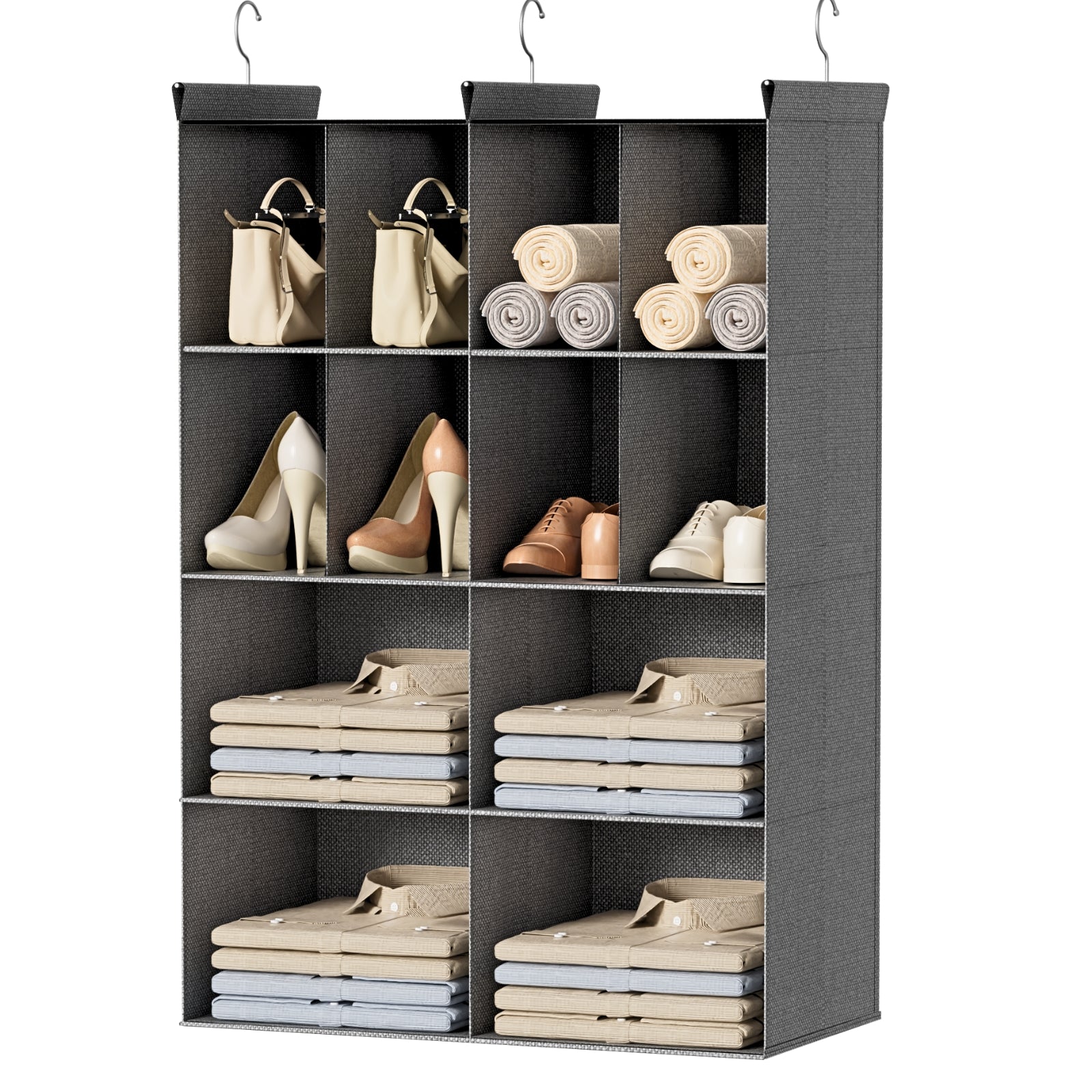 - 【3 Sturdy Hooks for Secure Hanging】Equipped with 3 sturdy hooks, this organizer ensures a secure fit for hanging in your closet, wardrobe, or garment rack. The strong hooks prevent slipping, keeping your organizer safely in place and offering reliable storage for your clothes and accessories, even in high-traffic areas.
