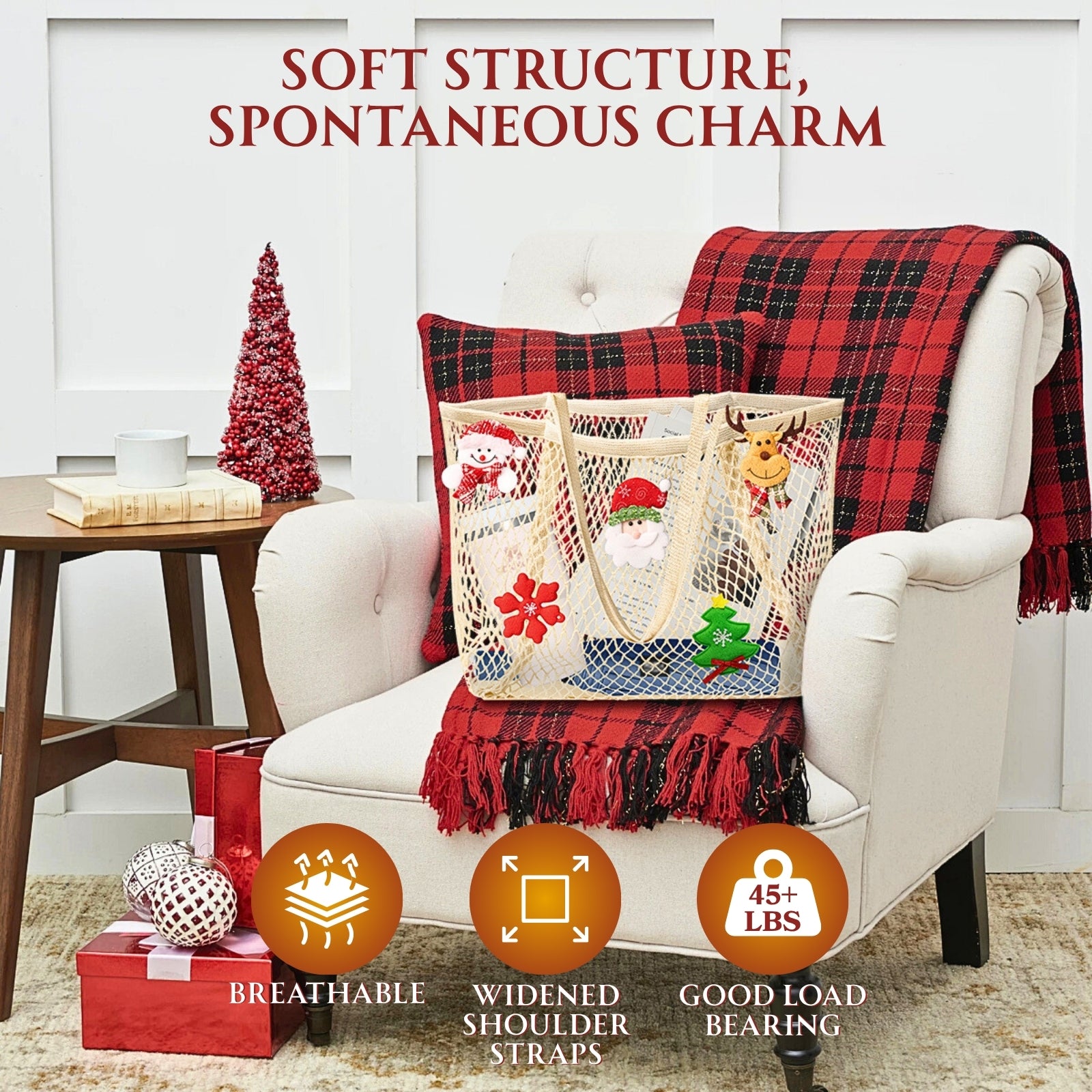 - 【Durable and Odorless】 Our high-quality Christmas tote bag for women is made of 100% cotton fabric, soft and comfortable. Its unique mesh design is not only visually lightweight, but also highly breathable. It is durable and can hold over 45 pounds. Most importantly, it is odorless, machine washable, and quick-drying.
