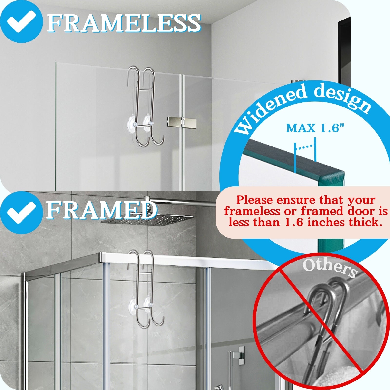 - 【FOR FRAMED & FRAMELESS GLASS DOOR】This Ofiray-home shower organizer hook is perfect for framed or frameless doors with a thickness between 0.25"-1.2". A clip on the top of the hook provides a secure fit for different thicknesses of glass. This is the best shower towel hook for you!