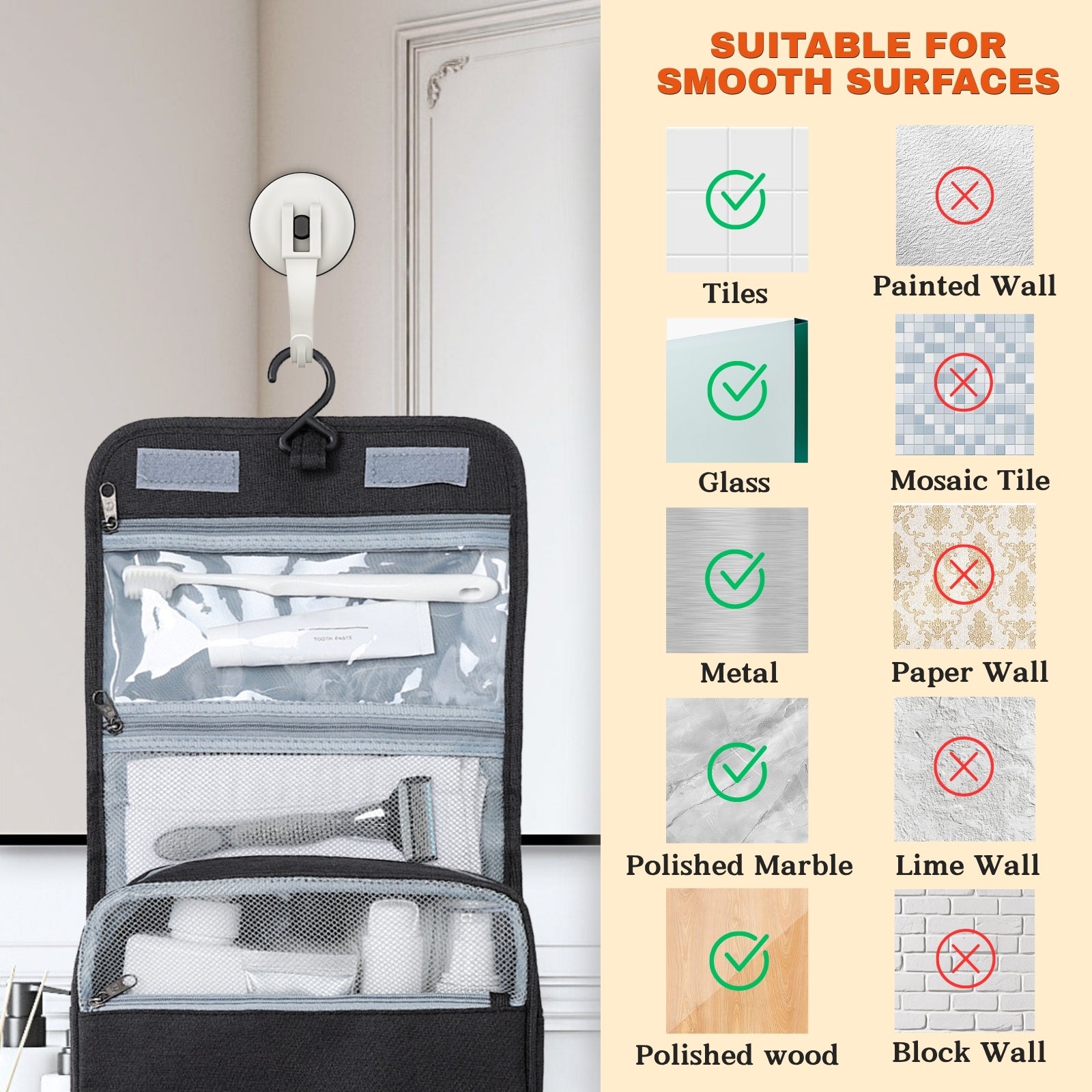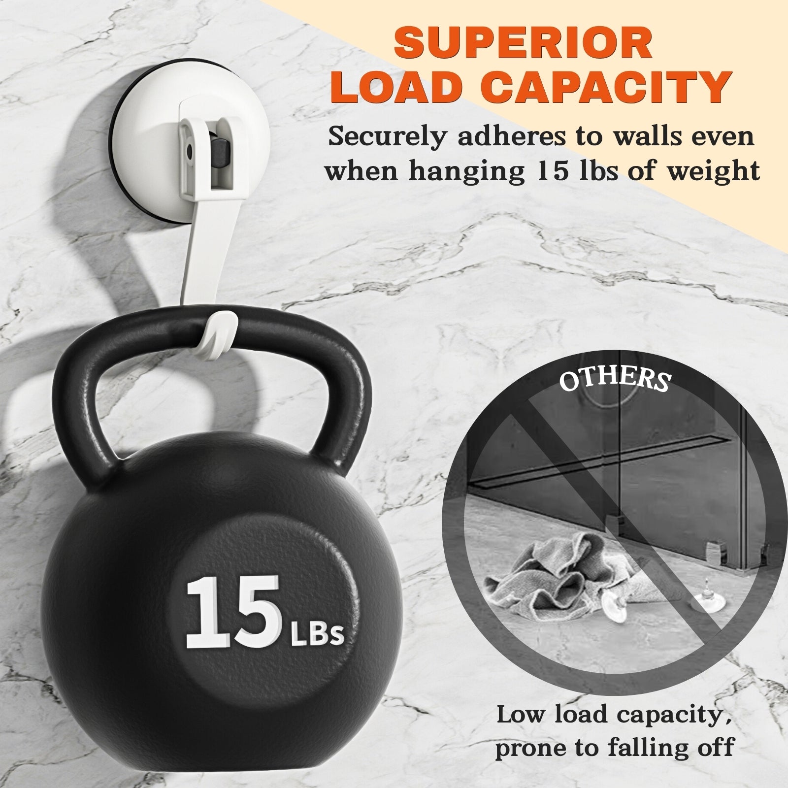 - 【Super Suction Cup Shower Hooks】Our suction cup hooks for shower feature a super-strong adhesive silicone base and advanced vacuum technology, ensuring a secure hold on smooth surfaces like bathroom tile and glass doors. With its strong suction force, a single hook can hold up to 15 pounds, enough to easily hang frequently used heavy items such as bath towels, bathrobes and household storage without falling