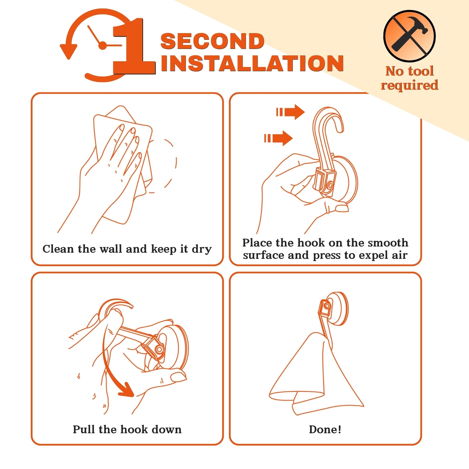 - 【Easy Installation, Wall-Friendly】The suction cup hooks for wreath requires no drilling or screwing. It attaches in just three steps: lift the hook to an upright position, press firmly on the suction cup to squeeze out any air, and then press down on the hook to securely attach. It does not damage the wall, providing a safe and convenient storage solution