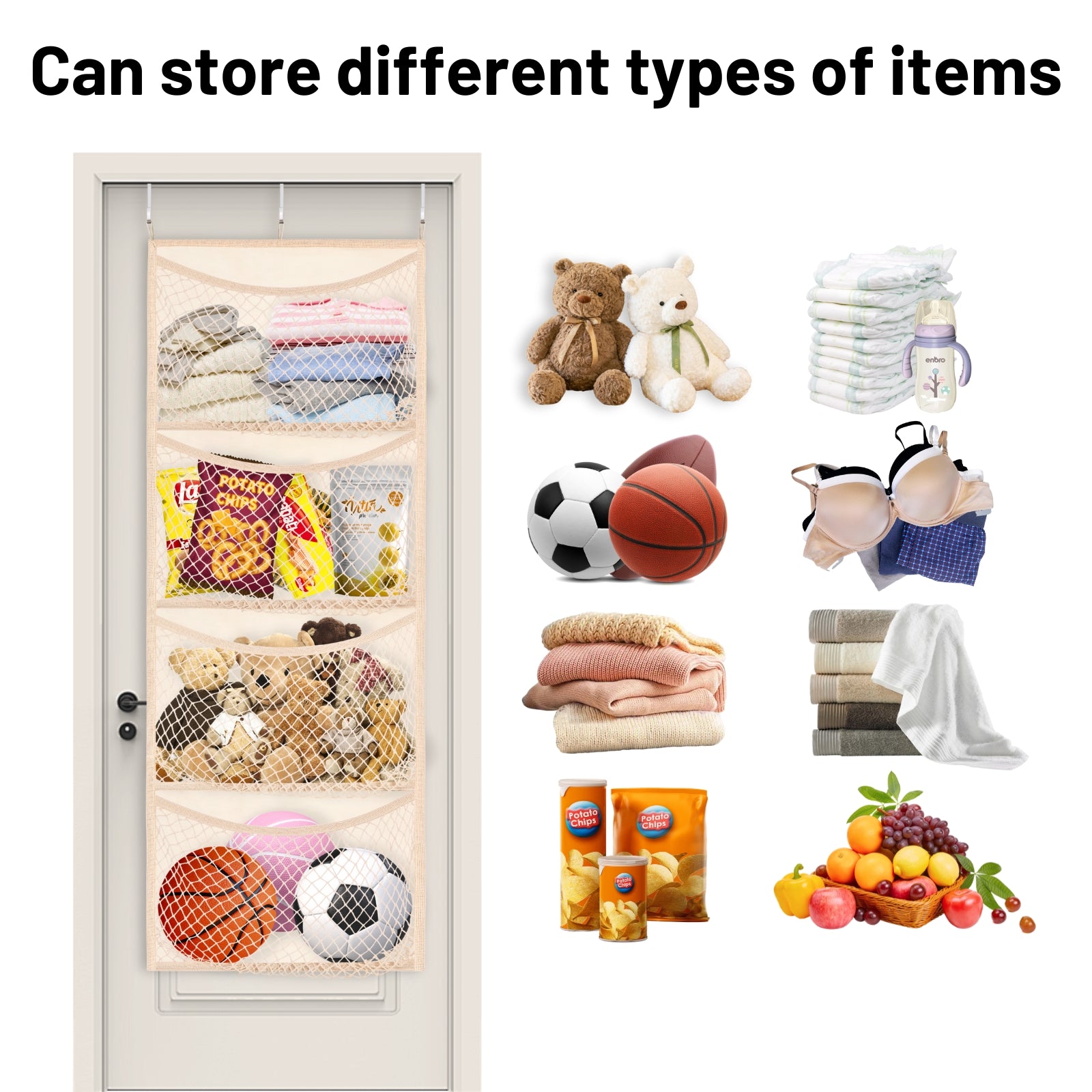 - 【Efficient Door-Hanging Toy Storage】Our versatile toy storage organizer serves as a stuffed animal net, conveniently hanging on any door without occupying extra floor or bed space. It's a perfect solution to keep your room tidy and spacious, whether in the playroom, bedroom, or RV. Additionally, it offers a variety of uses, ideal for storing not only toys but also baby products like diapers, gift wrapping paper, and other soft items.